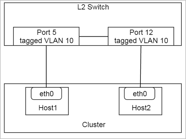 在上图这个配置中,交换机的两个端口5和12是带VLAN 10标签(tagged VLAN 10)的端口(Cisco中的VLAN 10干线端口,即trunk port), 并且分别连接到host1和host2上预先创建好的VLAN设备eth0.10。 对于L2NoVlanNetwork来说,这同样是一个有效的配置。管理员可以使用physicalInterface = eth0.10创建L2NoVlanNetwork,并挂载到集群。