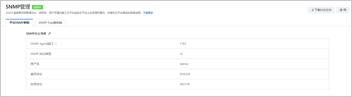ZStack Cloud支持SNMP参数可视化配置,包括SNMP Agent端口,协议类型、用户名、用户鉴权、数据加密等。这些参数主要用于和第三方平台快速对接。