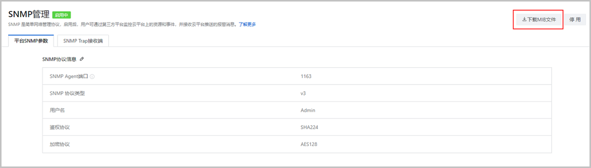 完成SNMP相关配置并实现第三方平台与云平台对接后,第三方平台即可根据OID指令采集云平台资源监控数据。ZStack Cloud提供专门包含OID信息的MIB库供用户下载使用。