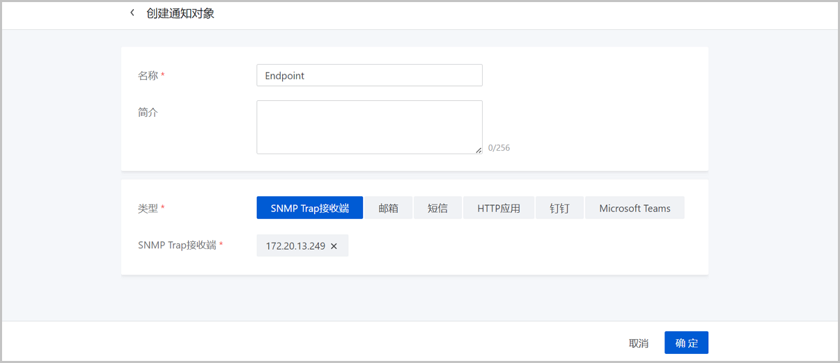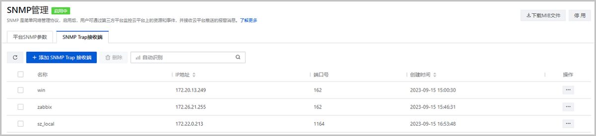 用户可将一个第三方平台添加为SNMP Trap接收端,并作为通知对象使用。将对应通知对象绑定到指定报警器后,即可向第三方平台推送云平台报警消息,第三方平台可根据MIB库解析收到的报警消息。