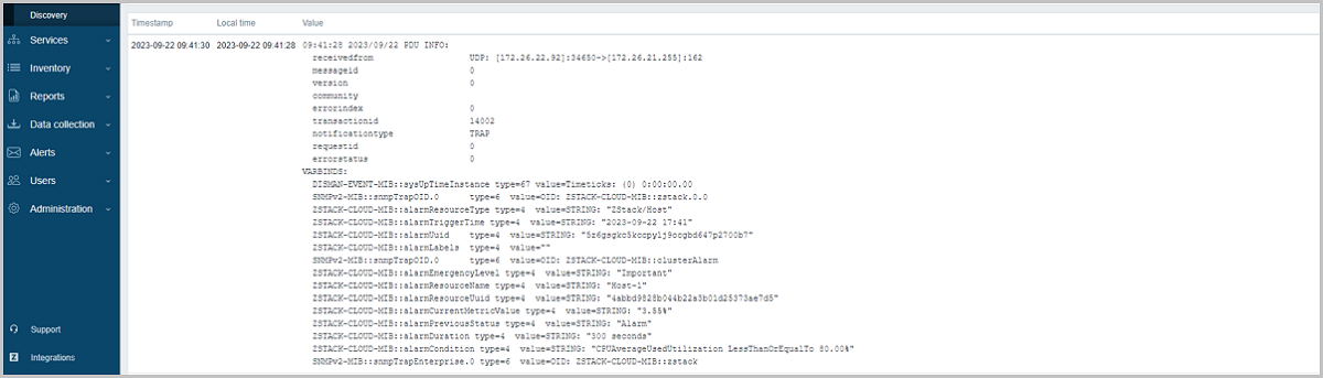 SNMP(Simple Network Management Protocol)是简单网络管理协议,用于管理网络中的设备。ZStack Cloud 4.7.21通过该协议实现第三方平台与云平台连通,从而使第三方平台能够监控云平台上的资源并接收云平台推送的报警消息。目前,支持v2c和v3两种协议类型。
