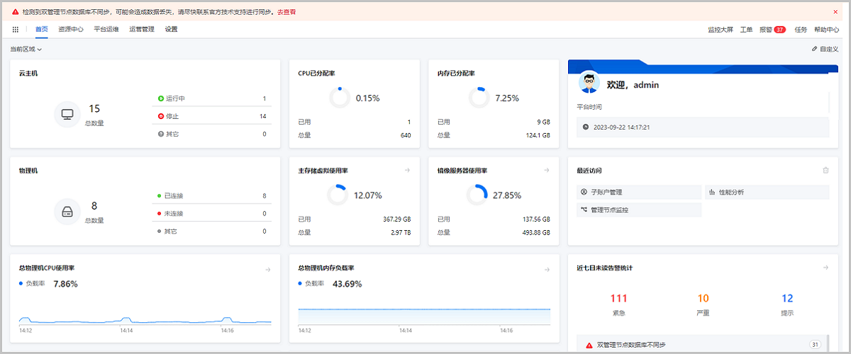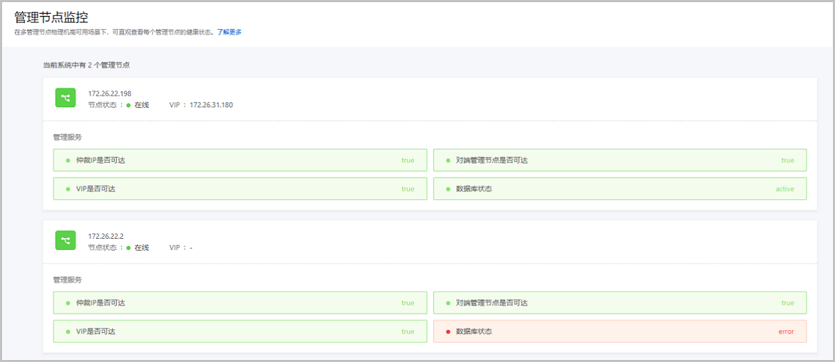 ZStack Cloud 4.7.21开始,检测到双管理节点数据库不一致时,管理节点监控界面的数据库状态项将显示为error并用红色标示,同时将出现全局风险横幅,提示用户及时采取同步措施,避免数据丢失风险。