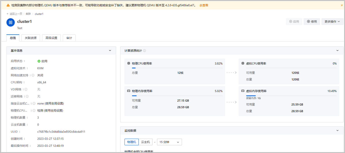 ZStack Cloud 4.6.21开始,集群详情页新增QEMU版本异常提醒。当集群内存在物理机QEMU版本与平台推荐版本不一致时,详情页将出现提示信息,建议用户查看并更新物理机QEMU版本,及时规避QEMU版本异常造成的安全或功能使用问题。
