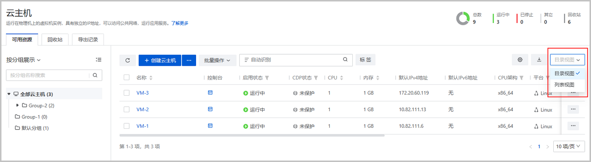 云主机目录视图和列表视图支持灵活切换。若需对当前界面切换云主机视图,直接点击界面右上角视图切换按钮即可。需注意:当前界面刷新后,将恢复默认视图展示,默认视图与全局设置云主机视图所选值保持一致。全局设置云主机视图用于设置云平台全局范围内云主机视图展示方式,默认为列表视图。
