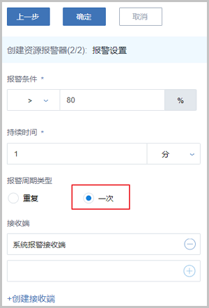 对于资源报警器,支持设置“重复”报警或“一次”报警,前者表示若资源满足报警条件,报警器会多次重复报警,后者表示若资源满足报警条件,报警器仅报警一次,但资源恢复正常后若再次满足报警条件,报警器将再次触发一次性报警。