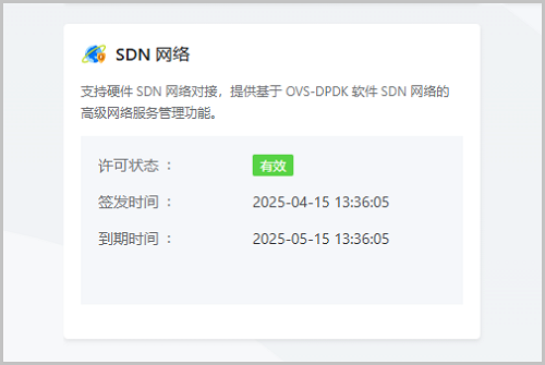 ZStack Cloud 5.3.28新增SDN网络模块许可证。该许可证用于授权硬件SDN网络对接和基于OVS-DPDK软件网络的高级网络服务管理功能。