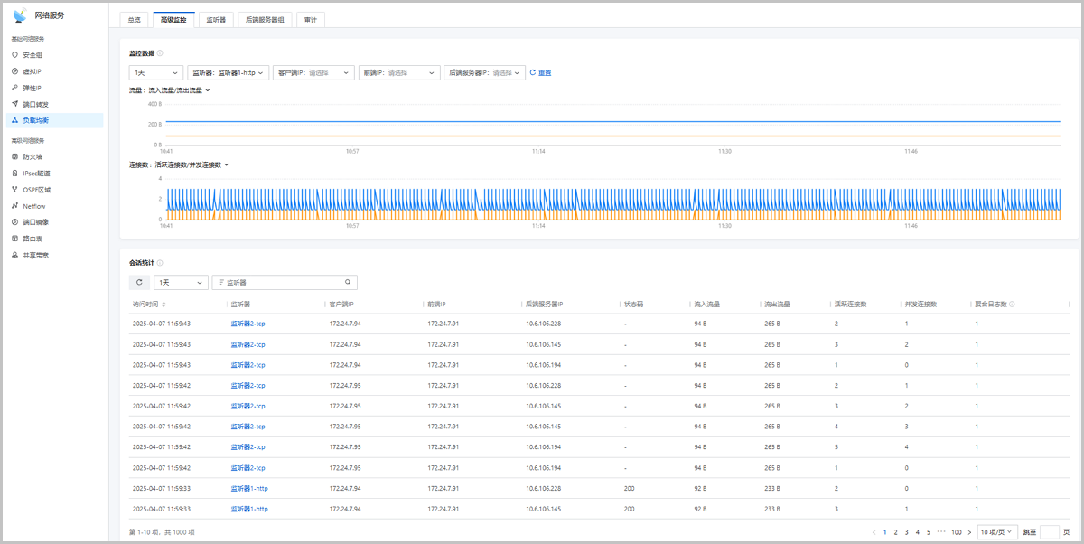 提供可视化表格,展示详细的会话统计信息,包括访问时间、监听器、客户端IP、前端IP、后端服务器IP、状态码、流入流量、流出流量、活跃连接数、并发连接数。可视化图表提升运维便捷性,帮助运维人员有效追踪会话来源、识别异常流量,保证业务稳定运行。