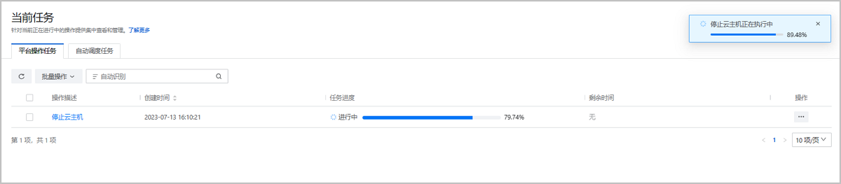 本页面针对当前正在进行中的操作提供日志查看,可查看该操作的操作描述、任务进度、任务剩余时间、任务创建时间,可取消正在进行中的任务。