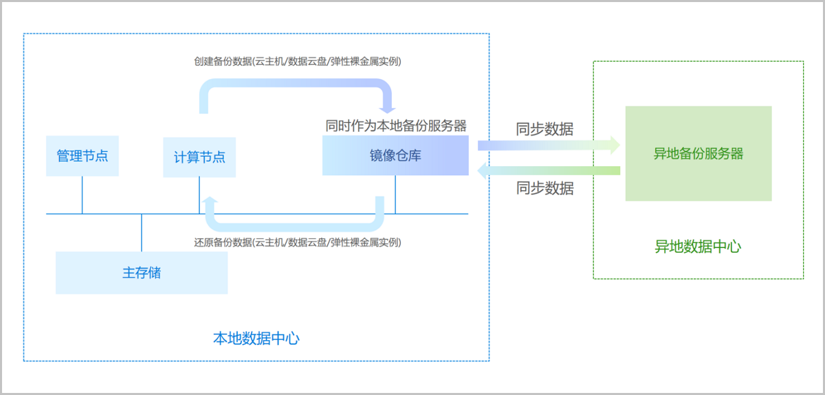 支持将本地部署的镜像仓库作为本地备份服务器,用于存放本地云主机/数据云盘/弹性裸金属实例/管理节点数据库(简称数据库)的定时备份数据。同时本地备份服务器支持主备无缝切换,有效保障业务连续性。