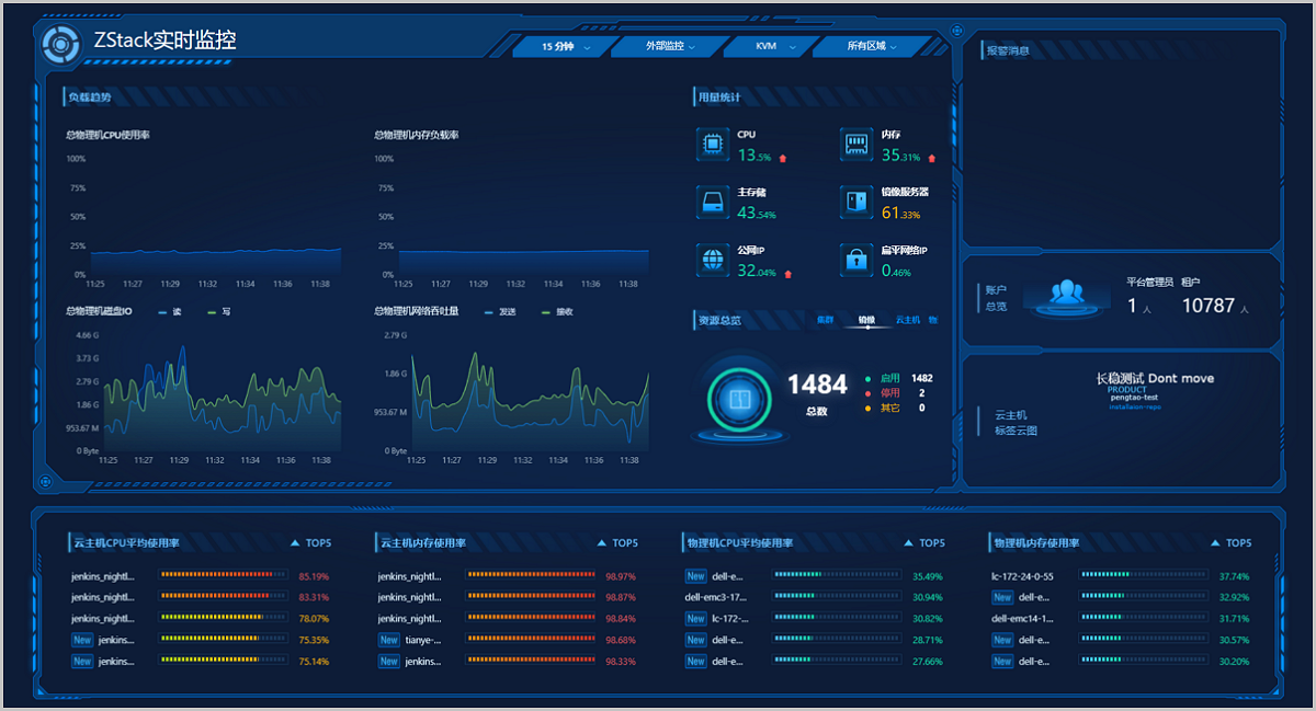 通过对所选虚拟化、区域中数据中心的云主机、物理机、镜像、集群等资源使用情况进行统计分析,对它们的资源总用量分别进行实时展示监控。