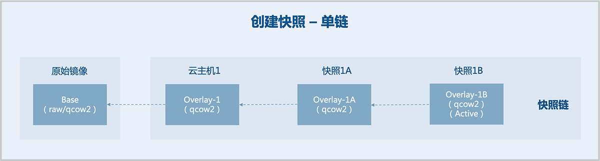 • 快照1B:新建空白文件Overlay-1B,backing file指向Overlay-1A,Overlay-1A置为只读,于是Overlay-1A成为一个快照,后续只对Overlay-1B写入数据。云主机1使用的是快照链内最后一个快照1B对应的磁盘文件,快照1B为Active。