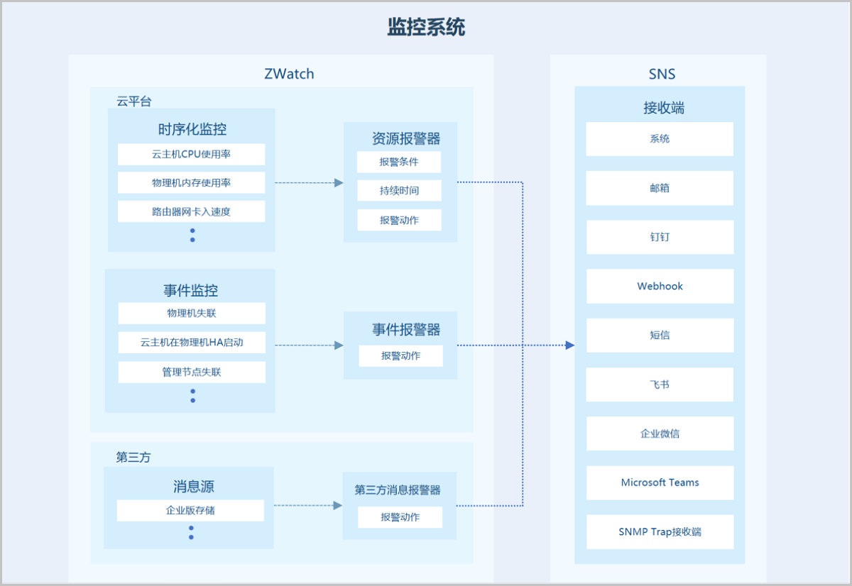 监控报警支持对时序化数据(如资源负载数据和资源容量数据)以及系统中发生的预定义事件进行监控,并通过通知服务(SNS)推送报警消息至指定的通知对象。支持资源报警器、事件报警器和扩展报警器三种报警器类型,支持系统/邮箱/钉钉/企业微信/飞书/Webhook/短信/Microsoft Teams/SNMP Trap接收端通知对象类型,部分资源报警器需安装agent才能使用。