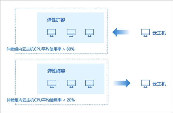ZStack Cloud提供基于负载均衡的云主机弹性伸缩,可根据用户业务的负载变化,按照预定义的策略,自动调整伸缩组内云主机的数量,提高云平台资源的使用效率,降低运维成本,保证业务平稳运行。目前支持KVM云主机的弹性伸缩。