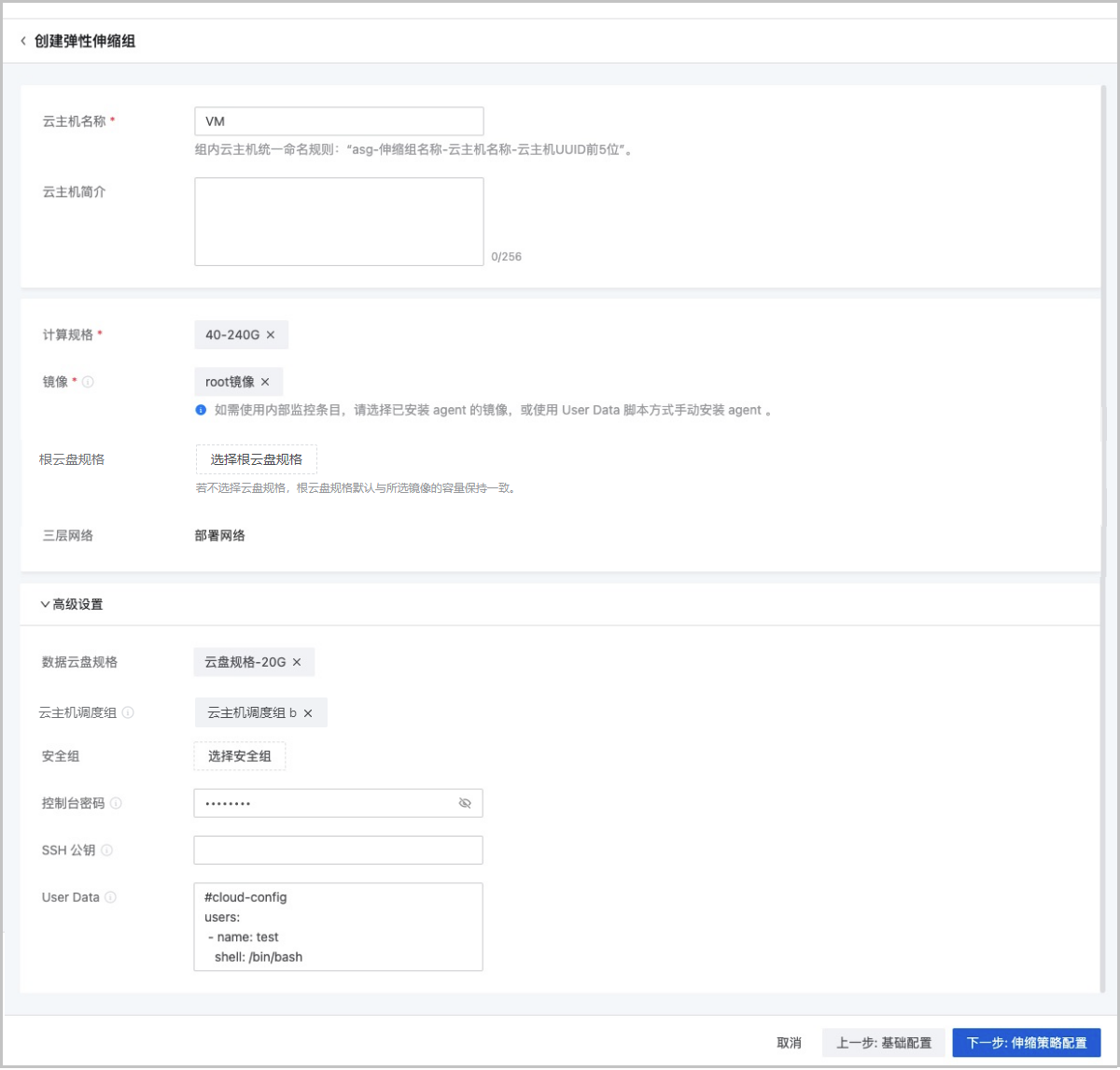 • User Data:导入User Data,通过上传自定义的参数或脚本,对云主机做定制化配置或完成特定任务。