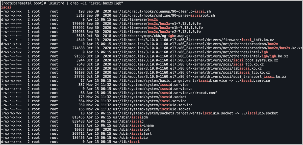echo 'add_drivers+=" bnx2x igb ixgbe megaraid_sas smartpqi"' >> /etc/dracut.conf.d/iscsi.conf //ixgbe为万兆网卡驱动,megaraid_sas和smartpqi为市场主流的两款RAID卡驱动cd /boot && dracut -flsinitrd | grep -Ei "iscsi|bnx2x|igb"
