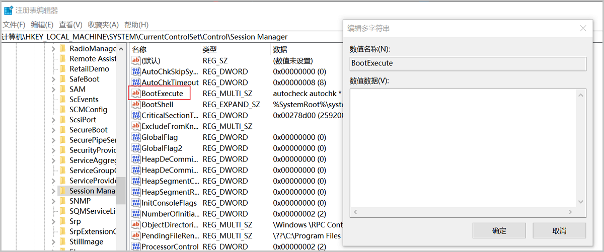 Win+R输入regedit打开注册表,查找HKEY_LOCAL_MACHINE\SYSTEM\CurrentControlSet\Control\Session Manager,在右侧查找点击BootExecute项目,清空数值数据后点击确定。