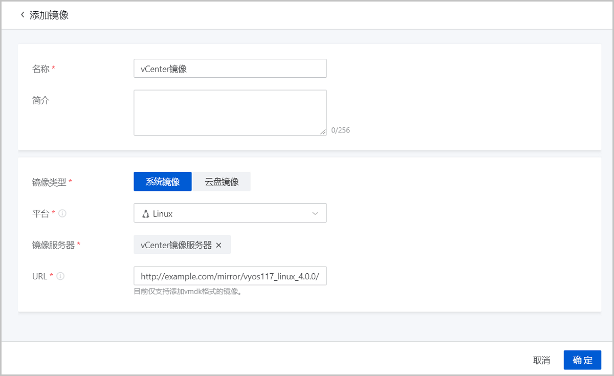 | 添加vCenter镜像 | 添加vmdk格式的本地镜像到vCenter,目前不支持加添ISO格式。 |
