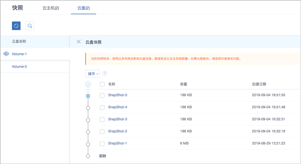 • 在生产环境中,建议单块磁盘的快照数量尽量控制在5以内。快照过多会影响云主机/云盘/弹性裸金属实例的I/O性能、数据安全以及主存储容量。如需长期备份,建议使用灾备服务。