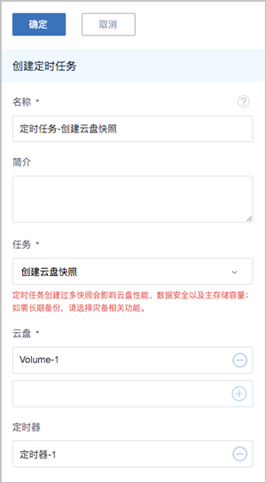 • 创建定时器:通过定时任务创建快照,用户需提前创建定时快照策略,系统会在设置的时间点自动对相应资源创建快照;