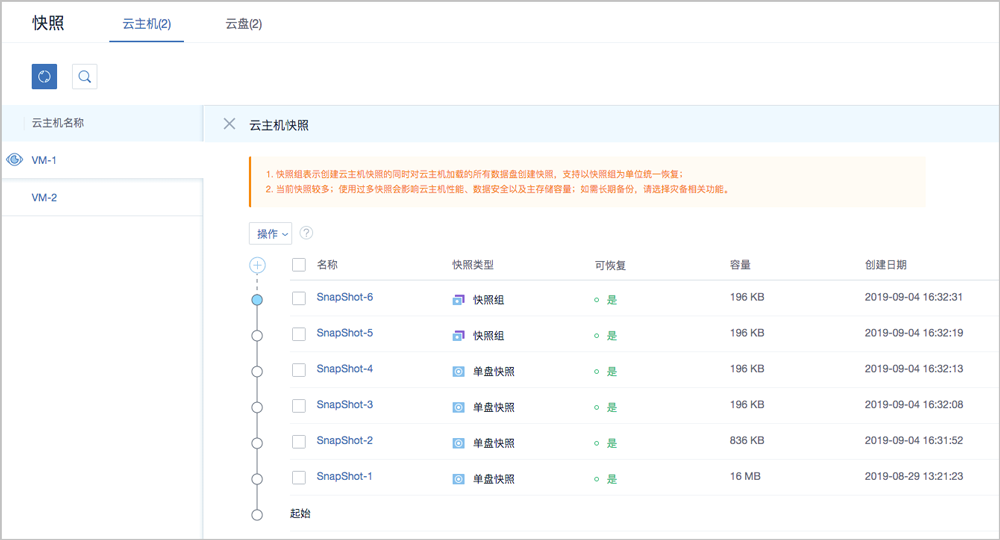• 快照节点为快照组类型,表示该时刻对云主机根云盘及所加载数据云盘批量创建快照,并将创建的根云盘快照及相关数据云盘快照以快照组形式展示。