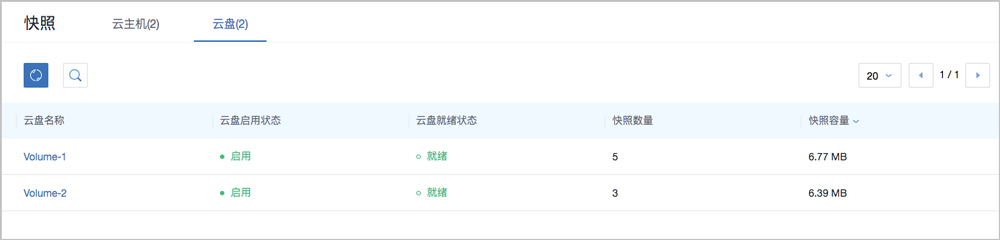 • 查看云盘快照容量:查看数据云盘的所有快照总容量,以及云盘快照树中单个快照节点容量。