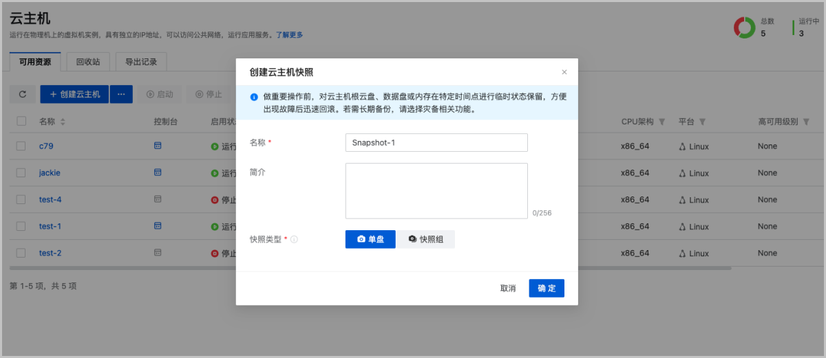 ZStack Cloud主菜单,点击资源中心 > 云资源池 > 虚拟资源 > 云主机,进入云主机界面。选择某一云主机(运行中/已暂停/已停止),点击操作 > 快照和备份 > 创建快照,弹出创建云主机快照界面。