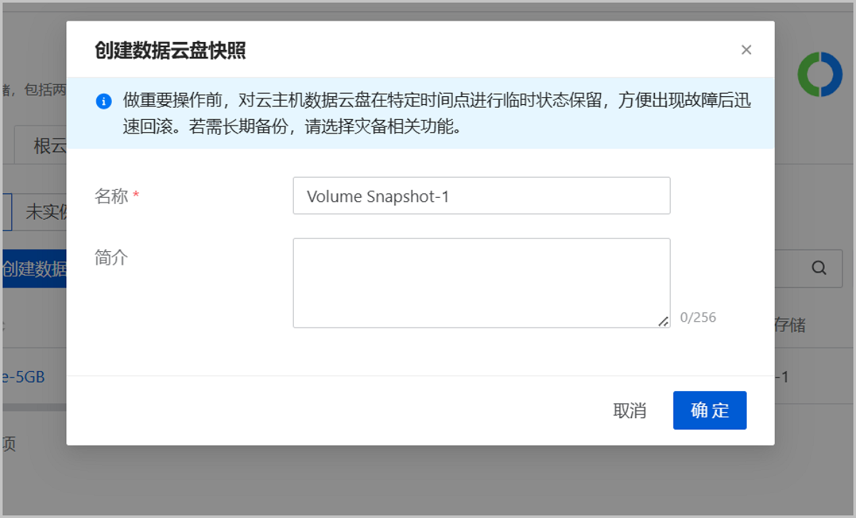 • 名称:设置云盘快照名称。命名规则:长度限制1~128字符,输入内容只能包含中文汉字、英文字母、数字、空格和以下7种英文字符 - _ . ( ) : + 且不支持以空格开头或结尾