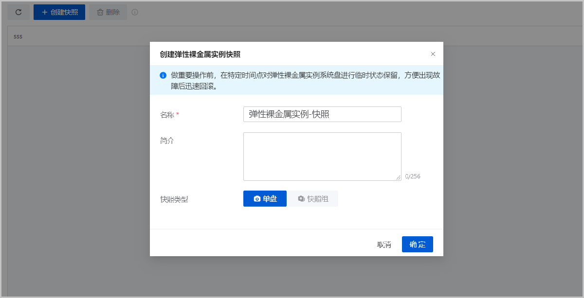 • 快照类型:仅支持对弹性裸金属实例根云盘创建单盘快照