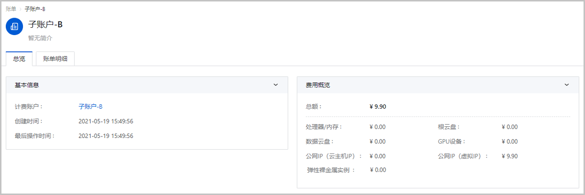 汇总账单显示指定时间段内项目/部门/账户的计费账单,方便用户快速了解近期消费情况。